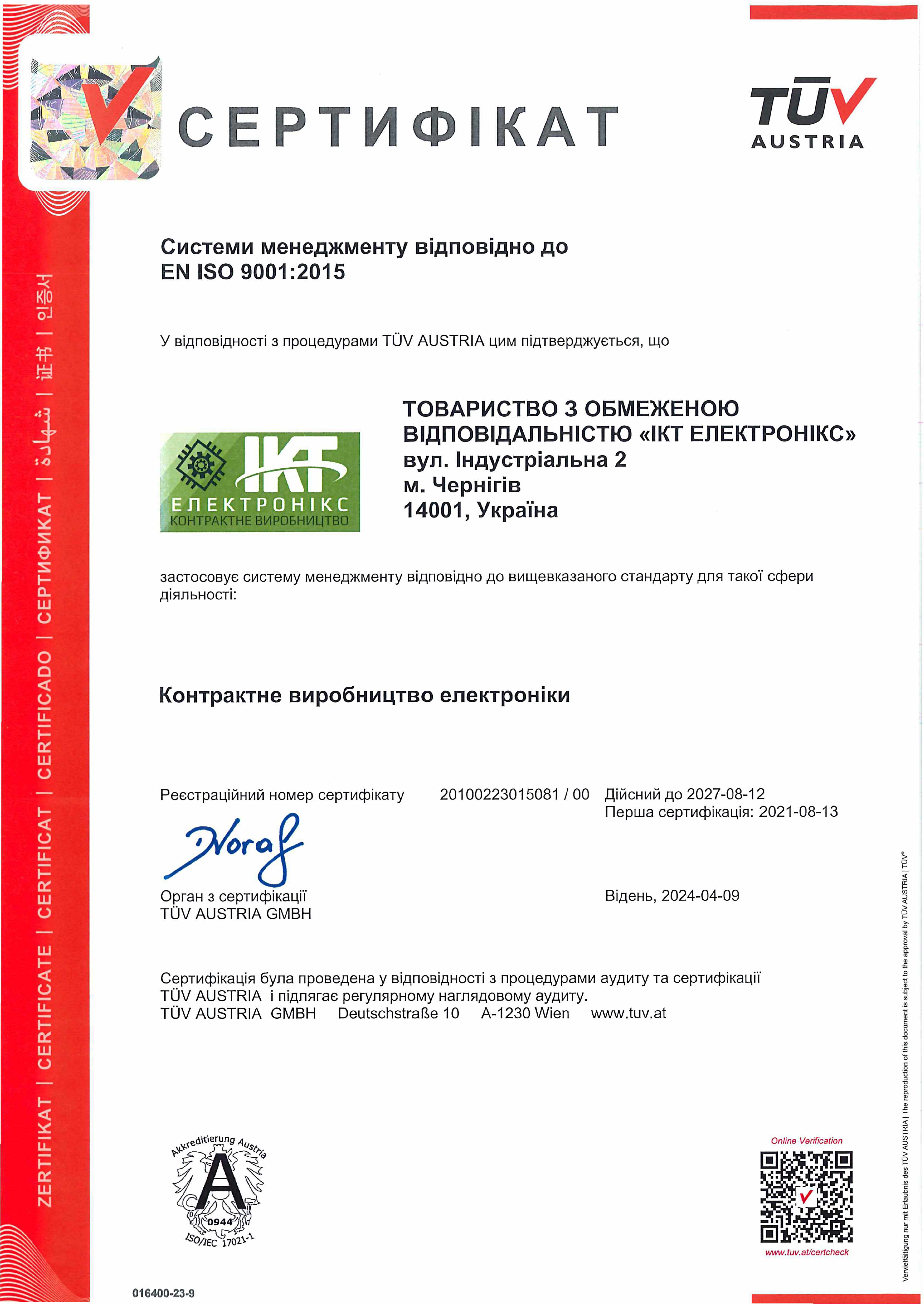 сертифікована міжнародним органом на відповідність вимогам стандарту ISO 9001: 2015